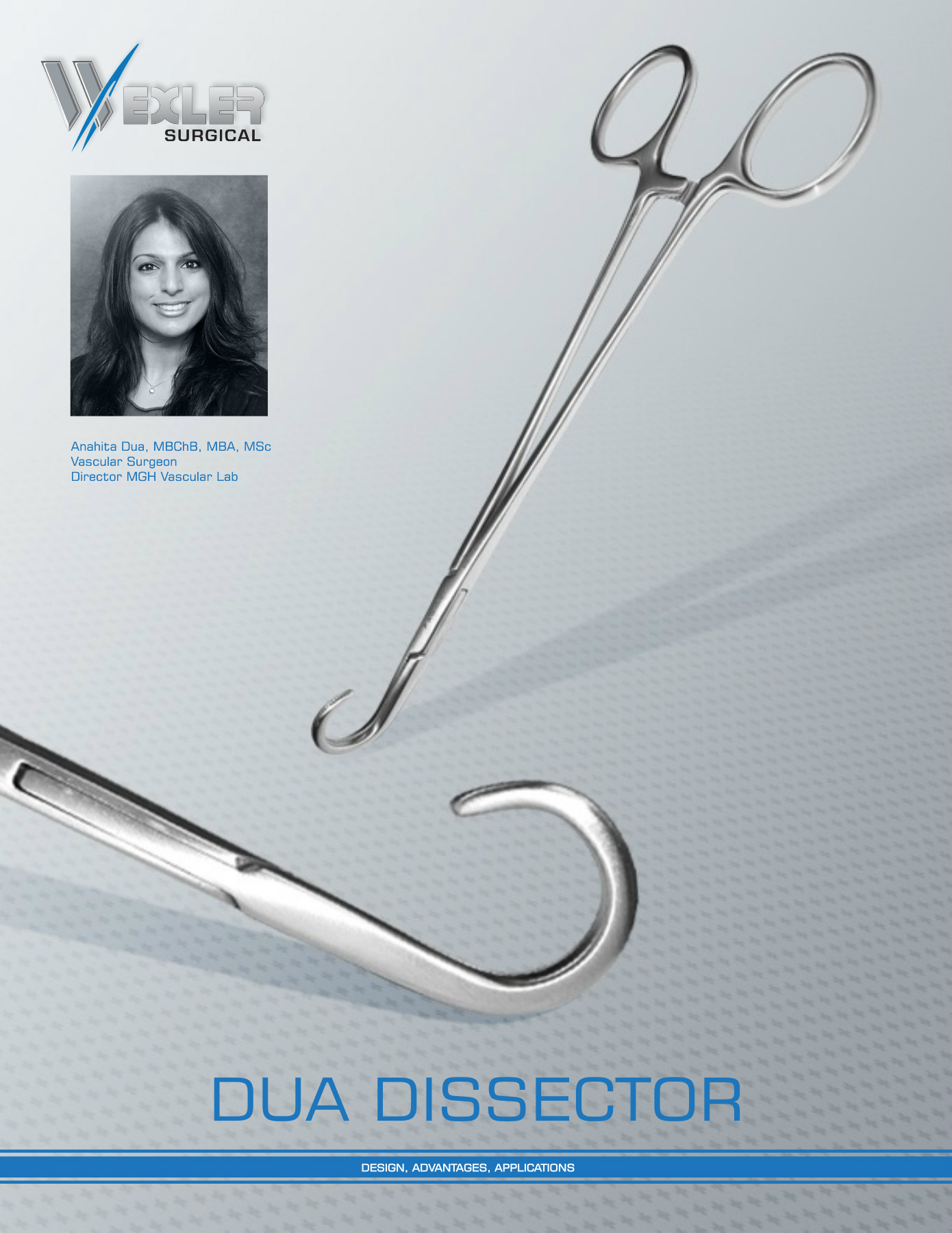 Standard right-angle dissectors are associated with inadvertent vessel wall trauma. The Dua Dissector protects against this type of injury by preventing past-pointing through a strategically engineered instrument head that maximizes visualization. The cupped head spreads to efficiently expose and cradle the dissected vessel within the surgical field. The Dua Dissector may be used in the open position to anchor the vessel for further surgical manipulation thus replacing the need for cumbersome vessel loops.