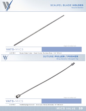 SCALPEL BLADE HOLDER Round Handle Images not actual size VATS•MICS SUTURE PULLER / PUSHER Ring Handle | Straight Tip Images not actual size VATS•MICS MICS VALVE 59